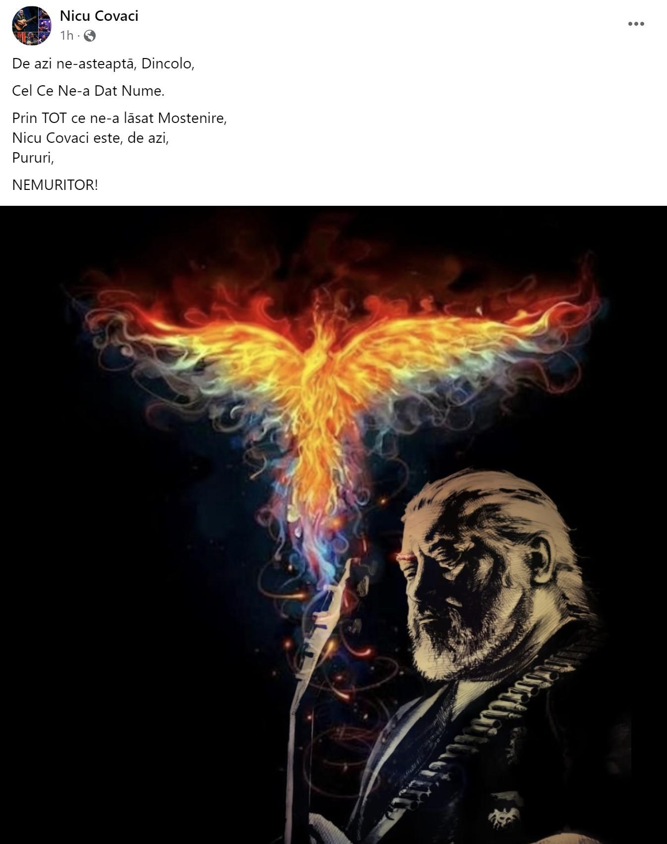 Decesul lui Nicu Covaci a fost confirmat vineri seara și pe pagina oficială de Facebook a artistului, care în ultimele luni a fost utilizată de membrii actuali ai formatiei Phoenix.