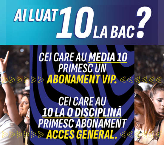 Astfel, elevii care au reușit performanța de a obține media generală 10 la examenul de Bacalaureat vor primi abonamente VIP, care le oferă acces extins și facilități speciale în cadrul festivalului. Cei care au obținut nota 10 la una sau mai multe probe, fără a avea media generală 10, vor fi recompensați cu abonamente Acces General, valabile pentru toate cele patru zile de festival.