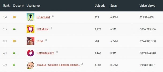Chiar daca cel mai urmarit canal de Youtube este „Be Inspired„, cu 6.33 milioane abonati, si are continut educational si motivational in limba engleza, utilizatorii din Romania sunt interesati de muzica in primul rand. Se evidentiaza aici canalele cu muzica pentru copii, canale ale caselor de discuri, dar si cele cu manele.