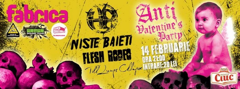 Te-ai săturat de toată campania din jurul lui 14 februarie importată din State? De baloanele colorate cu inimioară roşie, de tramvaiele vopsite ridicol, de sloganele siropoase cu “Te iubesc!”? Stai liniştit, că nu eşti singurul! Împreună cu tine s-au mai săturat şi cei de la: Nişte Băieţi, H8, Flesh Rodeo şi Till Lungs Collapse. Ei vor cânta pe scena din Fabrica pentru toţi oamenii normali care, vineri, 14 februarie, sărbătoresc doar începutul weekend-ului, nu şi alte prostii.