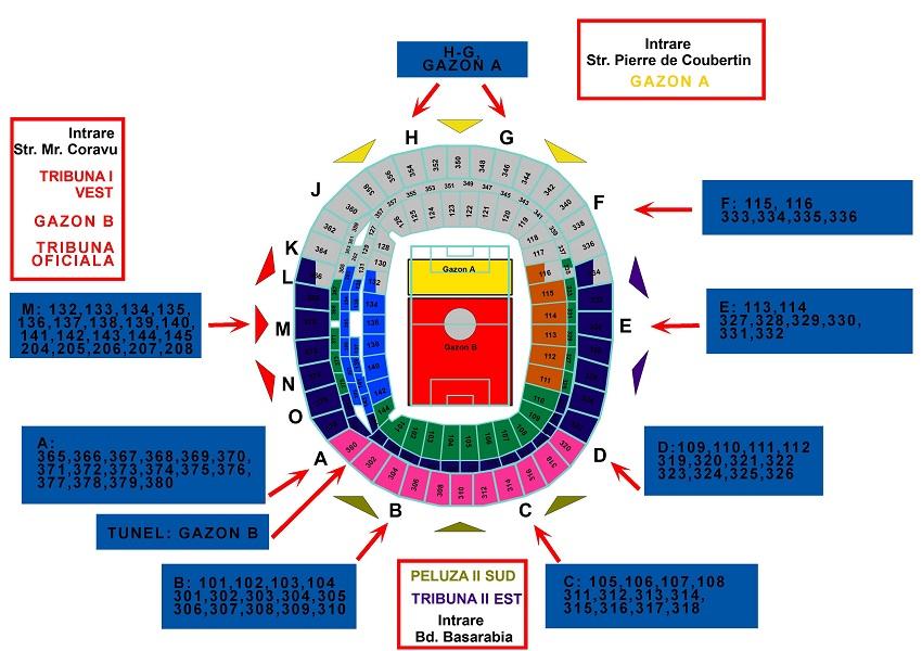 - posesorii de bilete în zona Tribuna 2 Est și Peluza Sud vor avea acces în locație pe la intrarea din Bulevardul Basarabia.