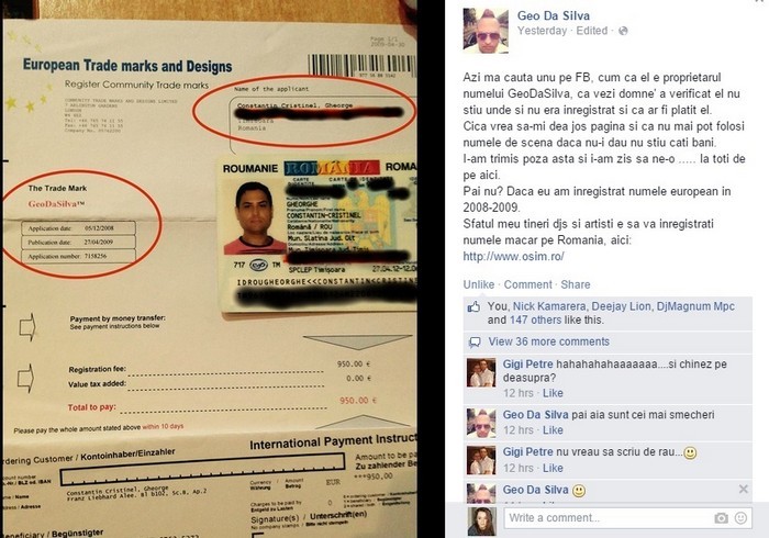 Artistul şi producătorul GeoDaSilva a înregistrat însă acest nume de scenă încă din anul 2008 şi are şi dovada! „Sfatul meu pentru tinerii artişti este să îşi înregistreze numele măcar pe România. Vă costă foarte puţin“, a scris artistul român pe Facebook.