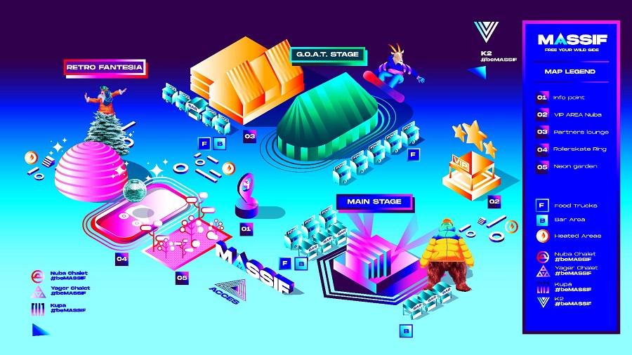 Fiecare scenă are stiluri de muzică diferite, propriul concept și design. Unii artiști vor îmbina mai multe genuri și vor crea mixuri eclectice de neuitat. Fanii se vor bucura de experiențe muzicale unice la prima ediție Massif, în timp ce urcă sau coboară de pe pârtie și își aleg locul preferat de petrecere.