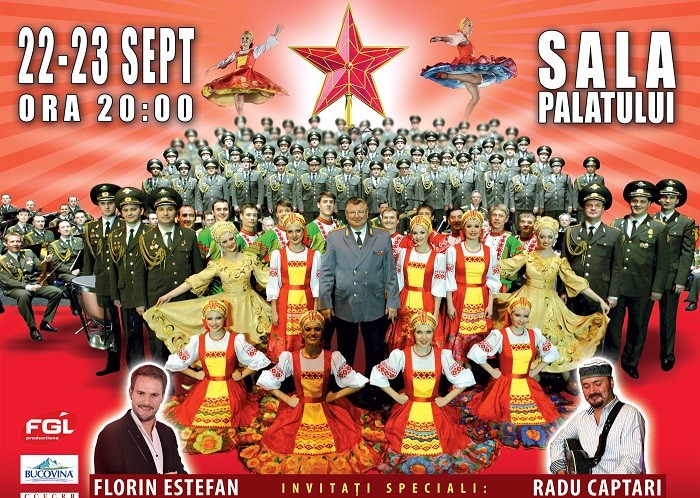 Corul Armatei Roşii, sub conducerea generalului Viktor Eliseev, va putea fi admirat pe 21 septembrie la Sala Polivalenta din Cluj-Napoca, iar la Sala Palatului din Capitală pe 22 şi 23 septembrie, în cel mai frumos spectacol de muzică şi dans din lume.