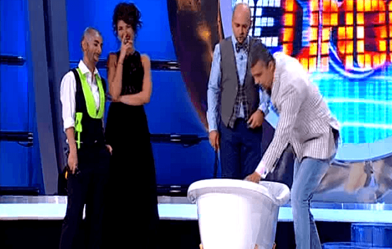 Mai întîi, Temişan îl “transformă” pe Cosmin într-o statuie şi îi agață de braț unul dintre pantofii pe care Dalma (Amy Winehouse) îi abandonase pe scenă. Apoi, încearcă să-i facă o băiță, în cada adusă în fața publicului, la momentul transformării lui Ellie White în Cabron.