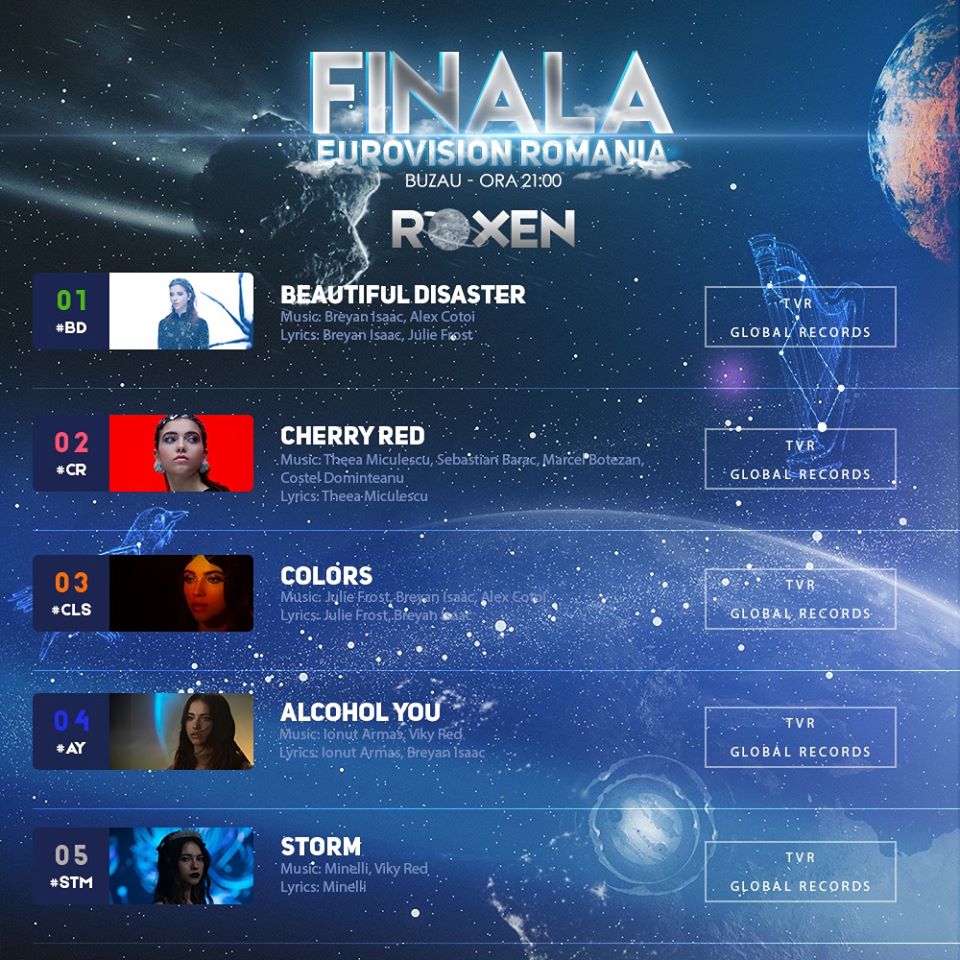 Publicul și juriul vor decide, cu pondere egala de voturi, cu ce piesă va merge Roxen la finala competiției europene. Sunt 5 piese in dezbatere (Alcohol You, Beautiful Disaster, Cherry Red, Colors și Storm) , fiecare fiind realizata special pentru eveniment.