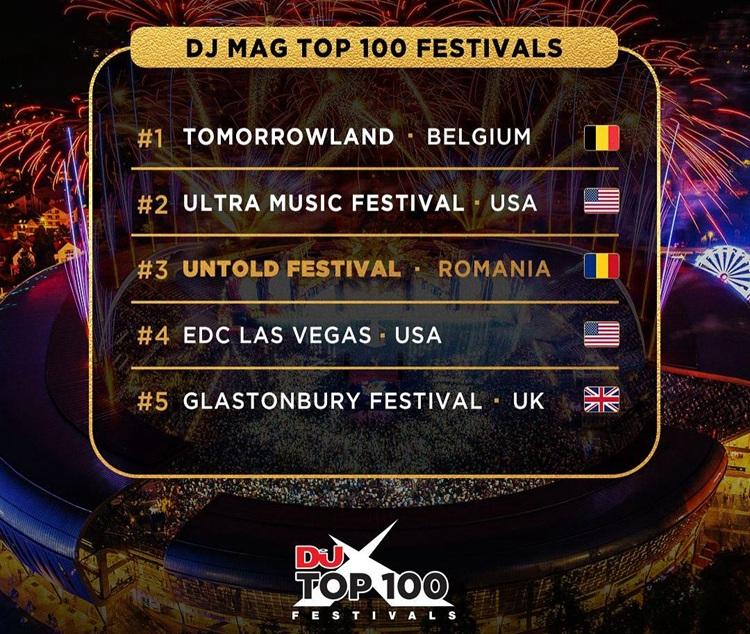 Organizat la Cluj-Napoca, UNTOLD, festival care ocupă locul 3 se află în compania unor giganți ai scenei globale, alături de Tomorrowland, Ultra Music Festival, EDC Las Vegas, Coachella, Glastonbury sau Creamfields.