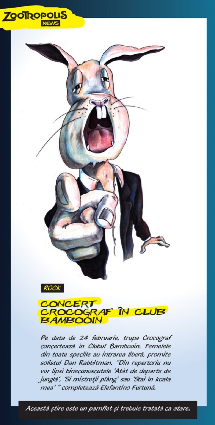 Printre pamfletele apărute pe internet se regăseşte şi afişul unui concert al trupei Crocograf în clubul Baombooin. Evenimentul are loc în seara zilei de 24 februarie, cu ocazia Dragobetelui, iar din repertoriu nu lipsesc melodii precum „Şi mistreţii plâng“ sau „Atât de departe de junglă“.
